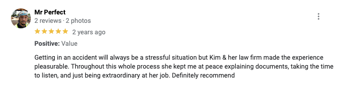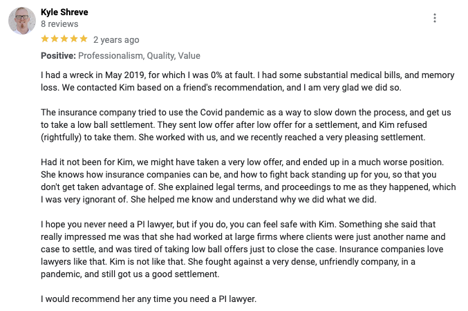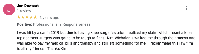 “A number one fantastic get it done get you paid attorney. Straight off got me taken care of medically then financially. With zero money out of my pocket. I’m telling you. Went against Walmart and WON! When no other attorney in Augusta would even take the case…said it was too hard to win…..not only took the case but won it. I would use her again and highly recommend that you choose her also. Thank you Kim Wichalonis!”